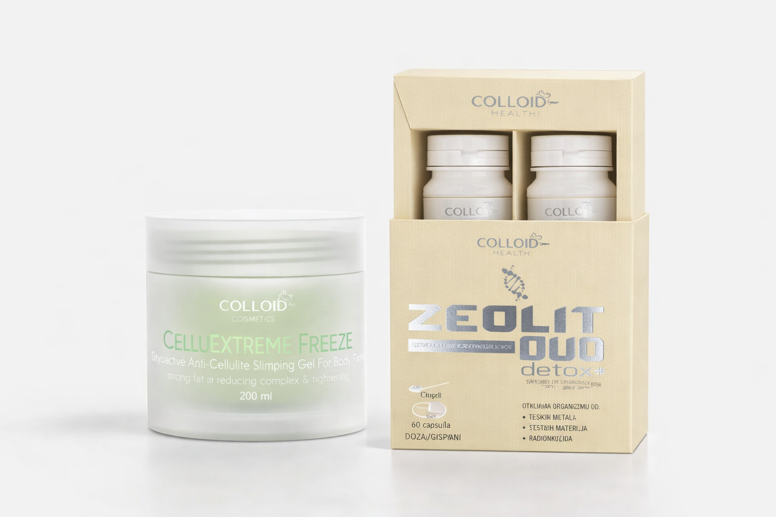 Kombinacija Zeolit Duo Detox+ i CelluExtreme Freeze deluje kao rutinski pristup detoksikaciji organizma i nezi kože. Zeolit pomaže oslobađanje tela od teških metala i štetnih materija, dok gel sa efektom hlađenja pruža osećaj zategnutosti i svežine kože.